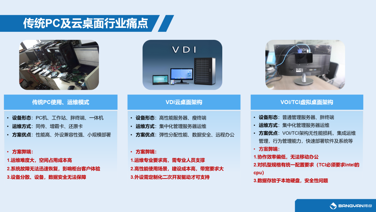 VOI/TCI£¨ÐéÄâ²Ù×÷ϵͳ»ù´¡/Öն˼ÆËã»ù´¡¼Ü¹¹£©ÐéÄâ×ÀÃæ¼¼Êõ£¬ÔÚÓû§ÌåÑéÉϱíÏÖÇ·¼Ñ£¬Ð×÷Áé»îÐÔÊÜÏÞ£¬ÎÞ·¨Âú×ãÈÕÒæÔö³¤µÄÒÆ¶¯°ì¹«ÐèÇó¡£Í¬Ê±£¬Êý¾Ý°²È«ÐÔ½ÏÈõ£¬³ÉΪÆóÒµ²ÉÄɵÄÒ»´óÕϰ¡£